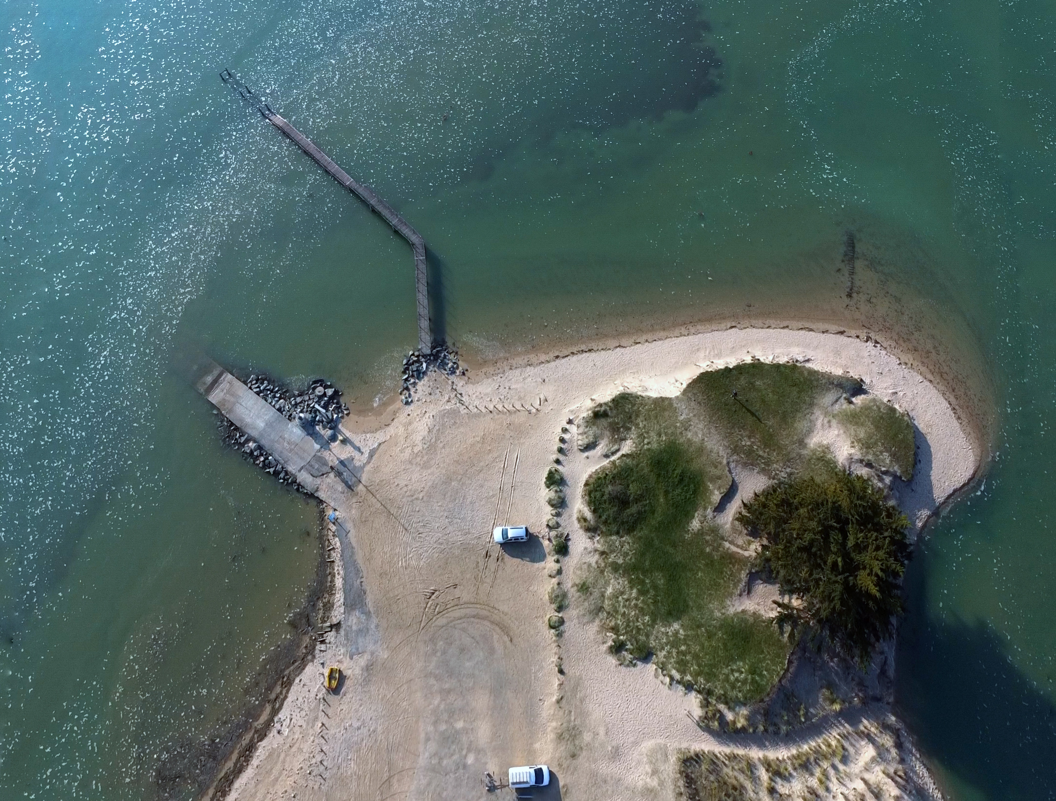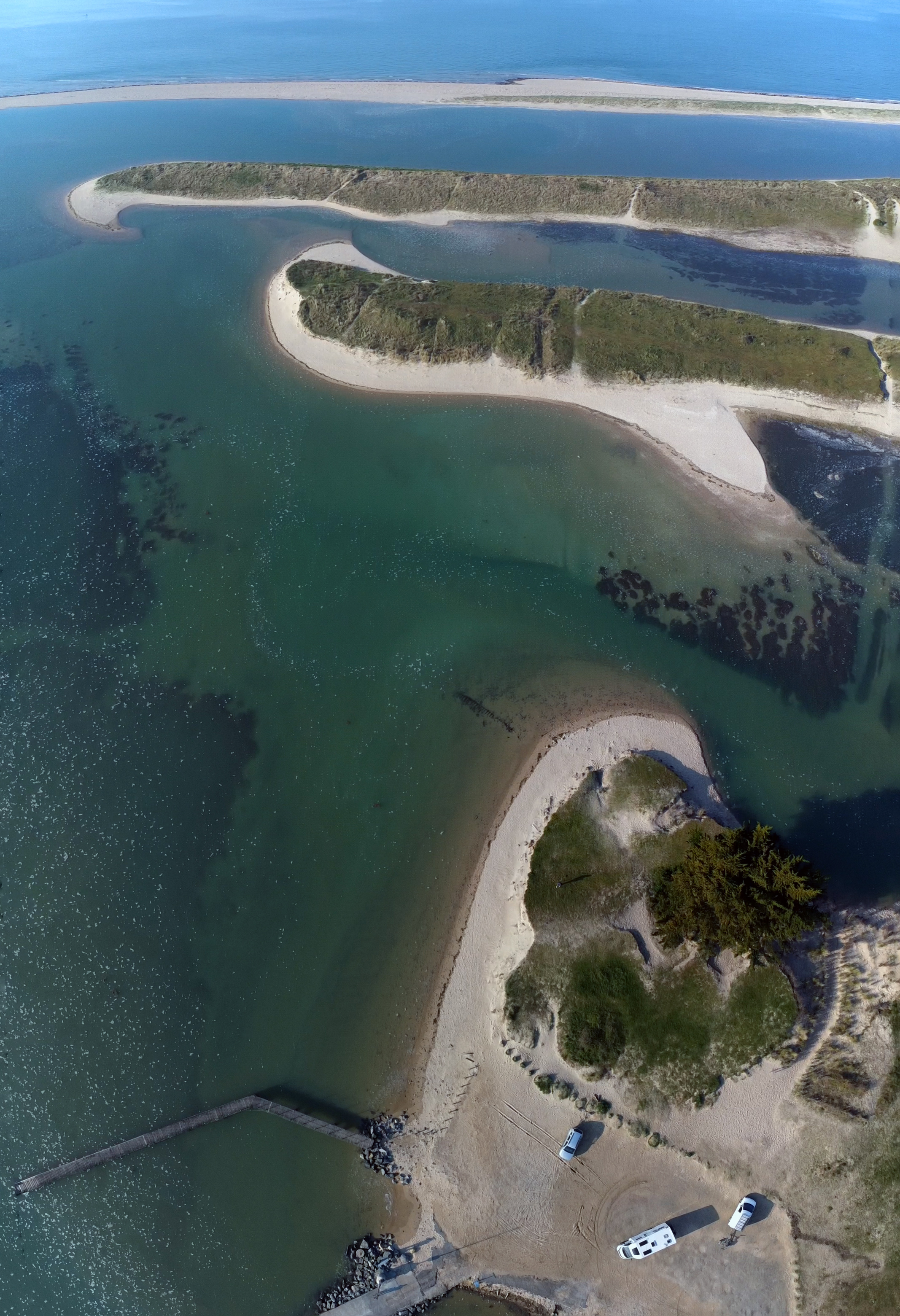 La marée haute sépare 4 pointes de sable. Vue au drone le 21 Avril 2023 à 9H00 (coeff.101)