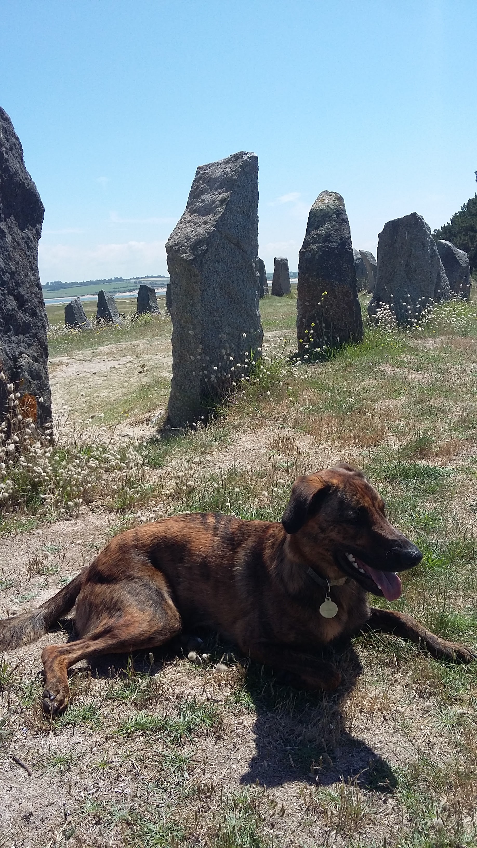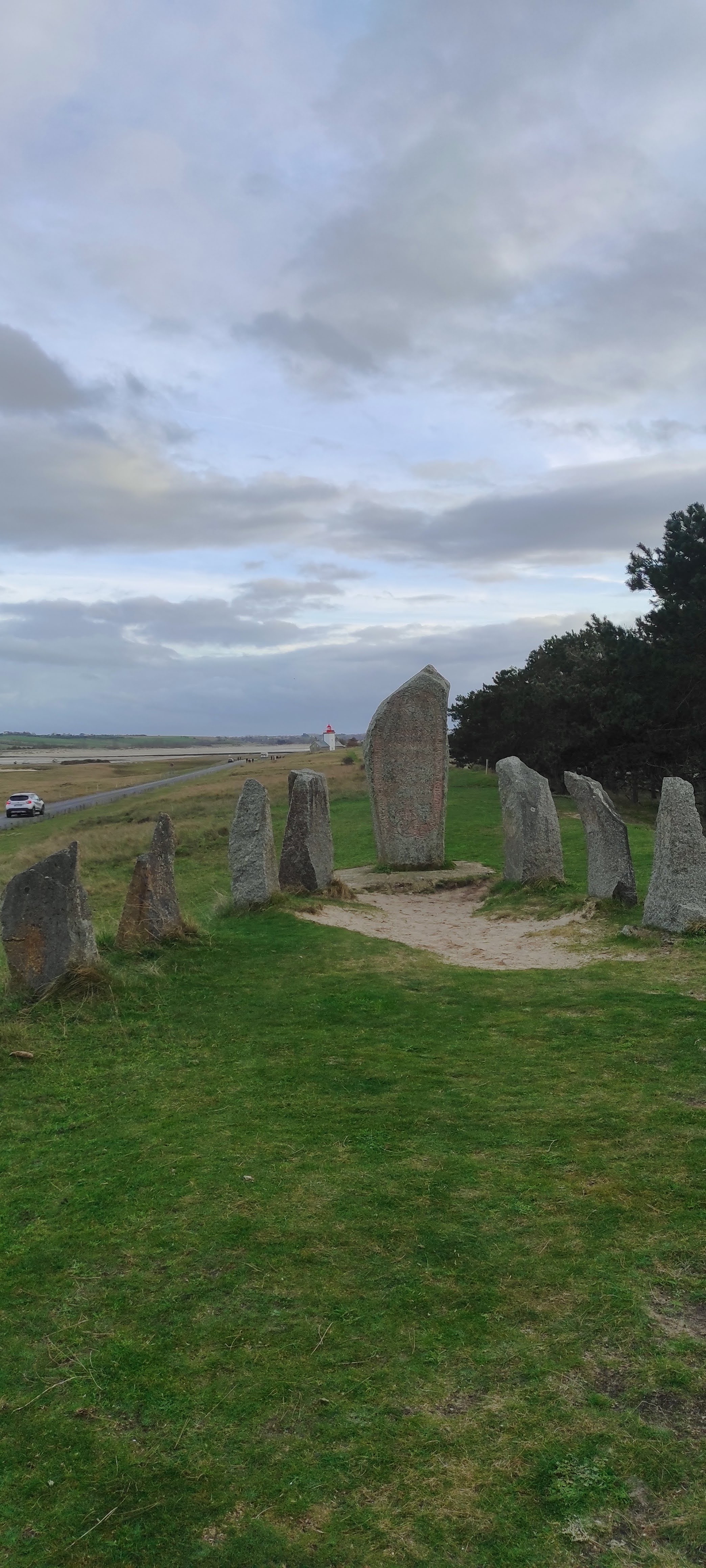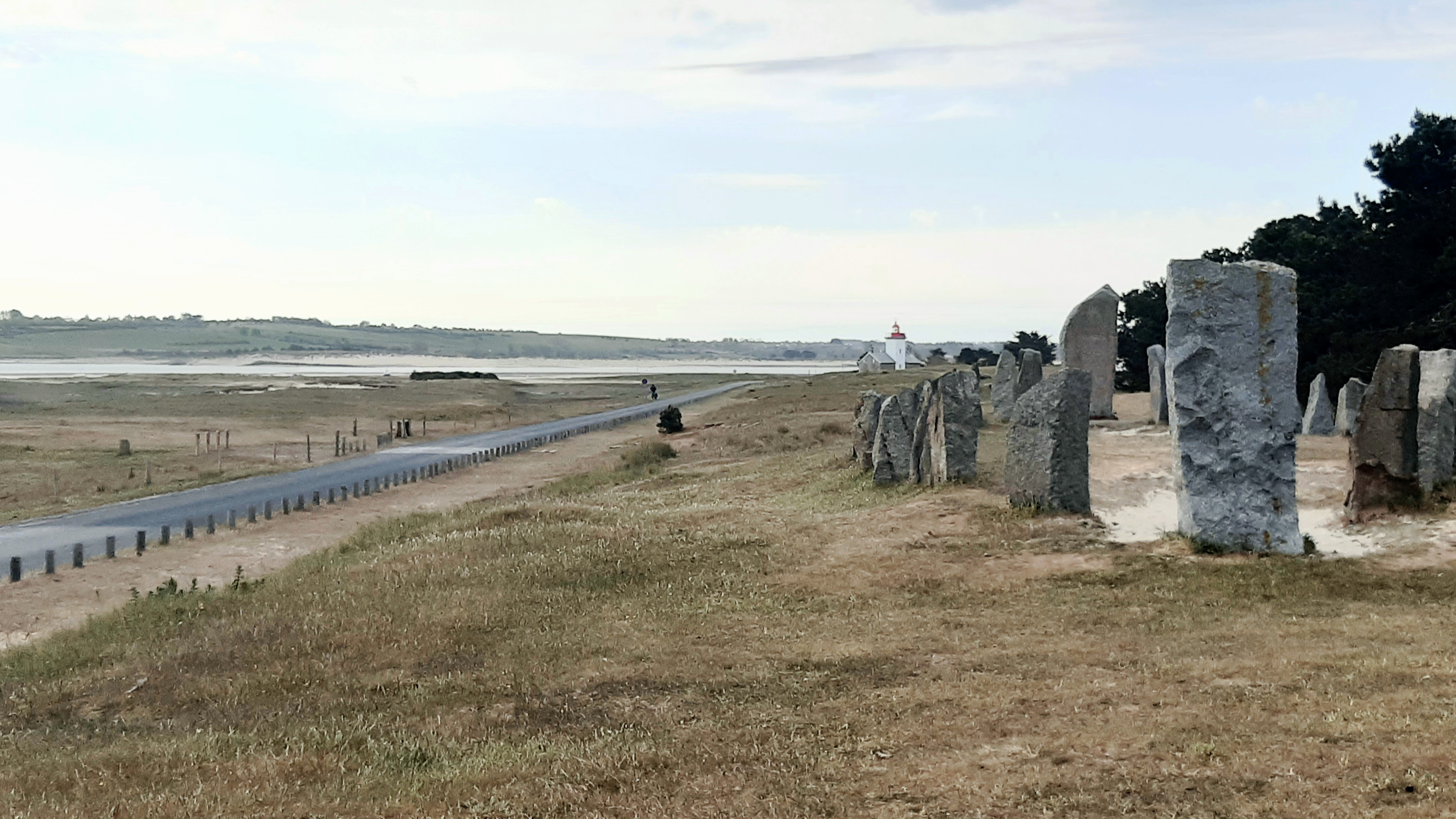 De grosses pierres verticales forment les contours d'un vieux navire viking découvert à cet endroit. A marée basse, on pouvait presque atteindre la ferme ostréicole où de nombreux travaux étaient en cours.