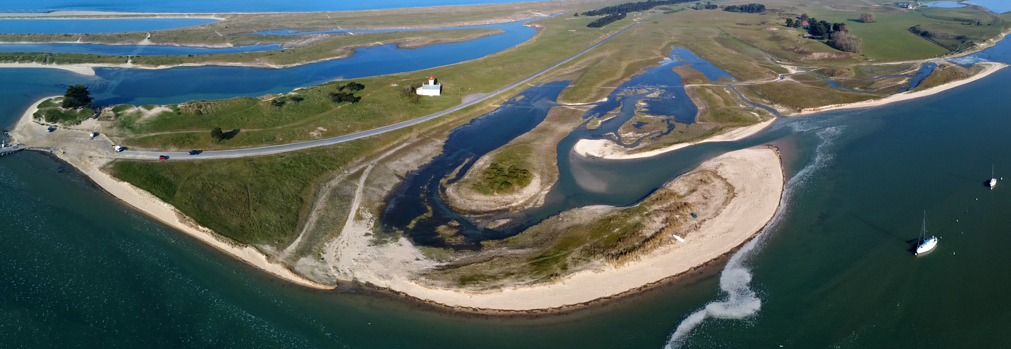 Des dunes refuges pour gravelots, de petits oiseaux aux plumes brillantes au soleil. Magnifique domaine de dunes sauvages en face d'un champ de moules.