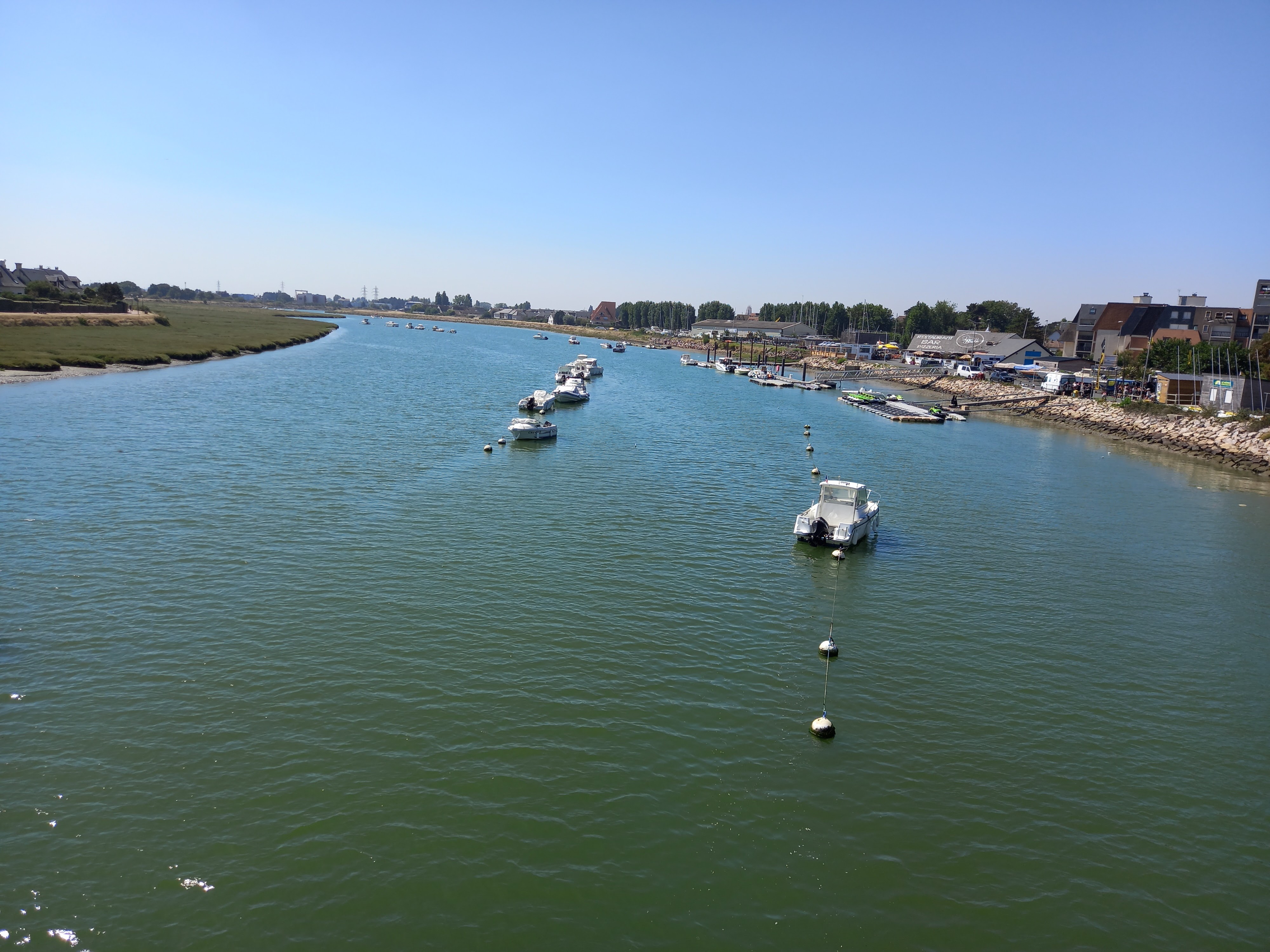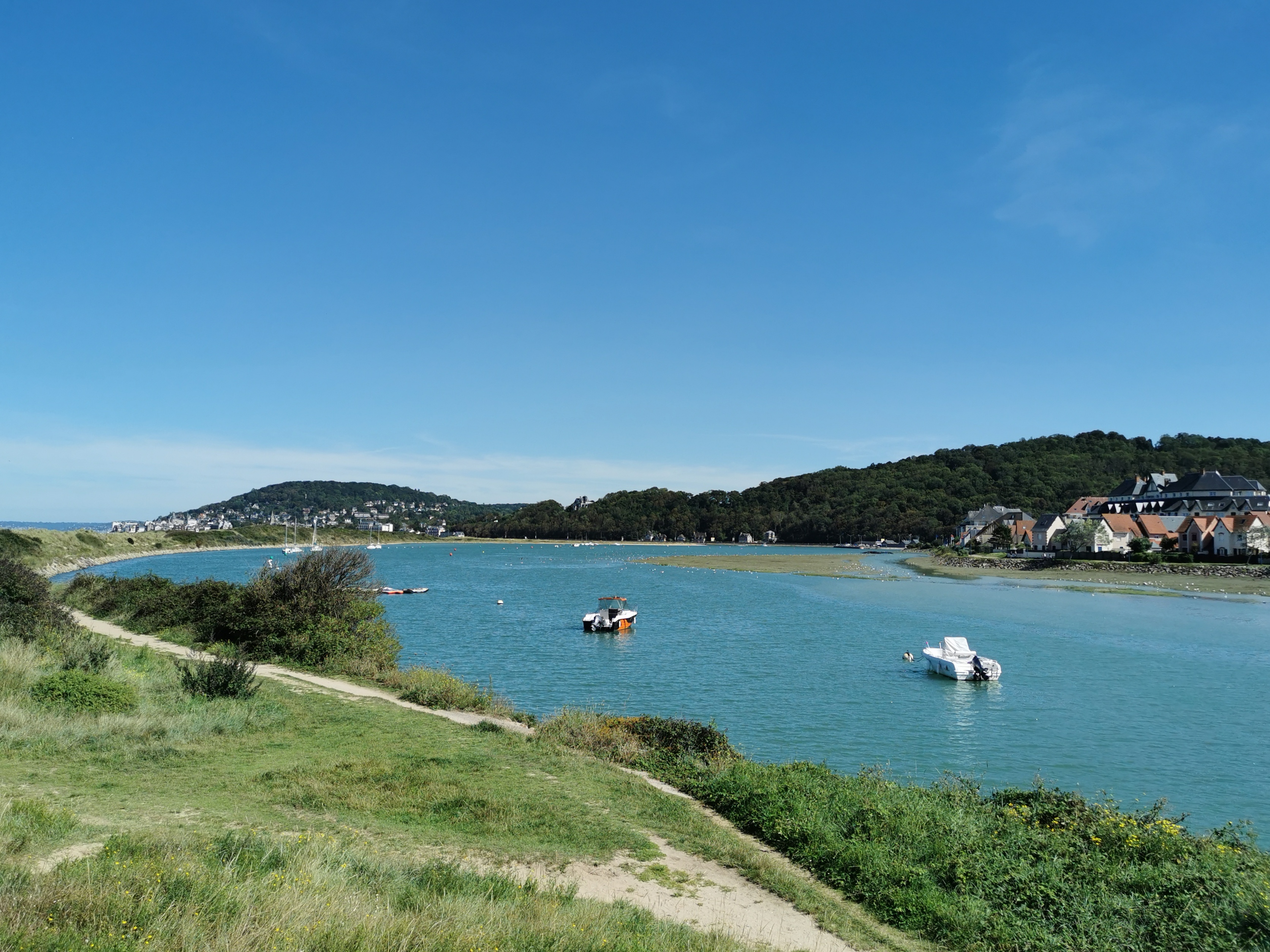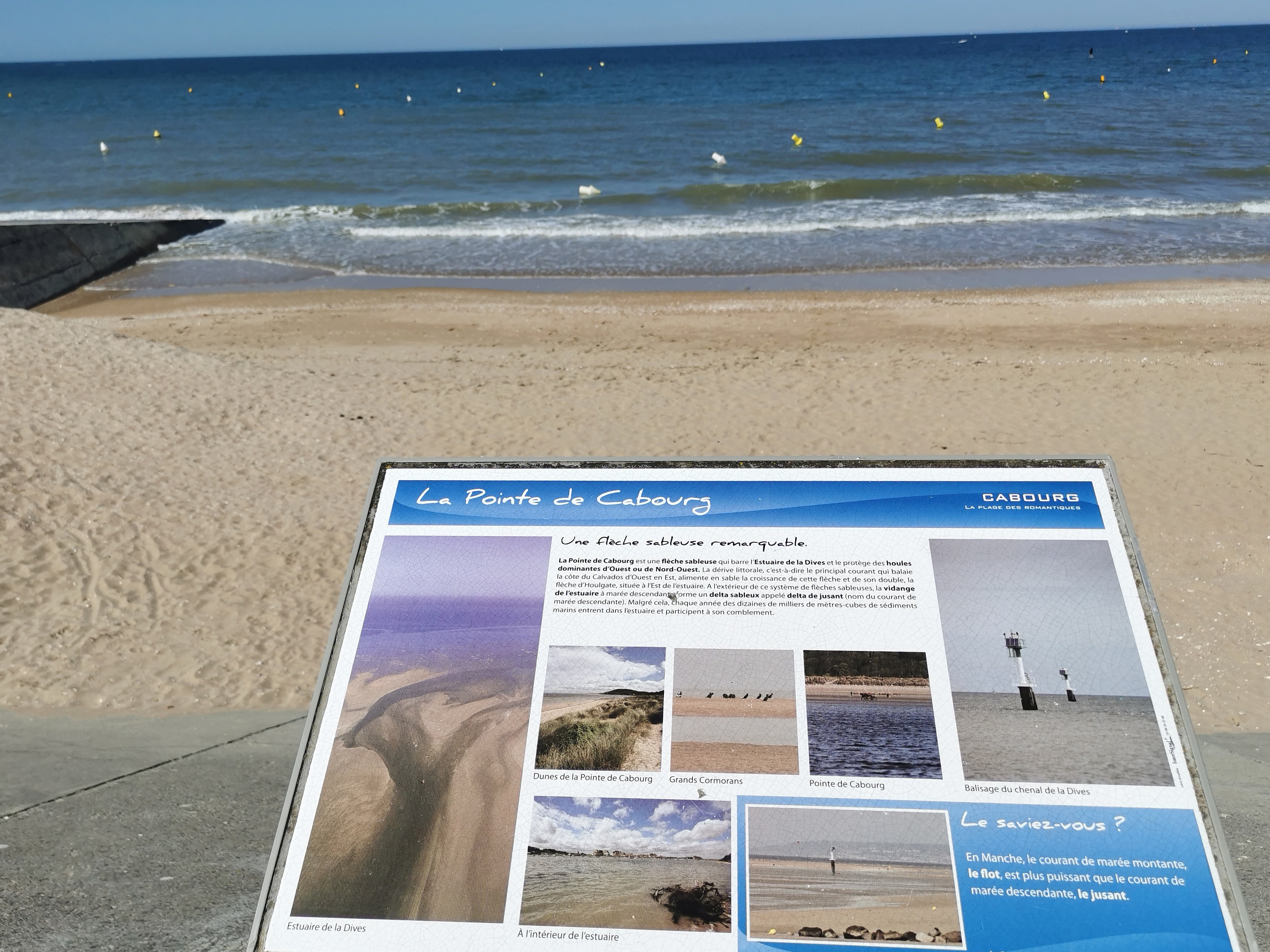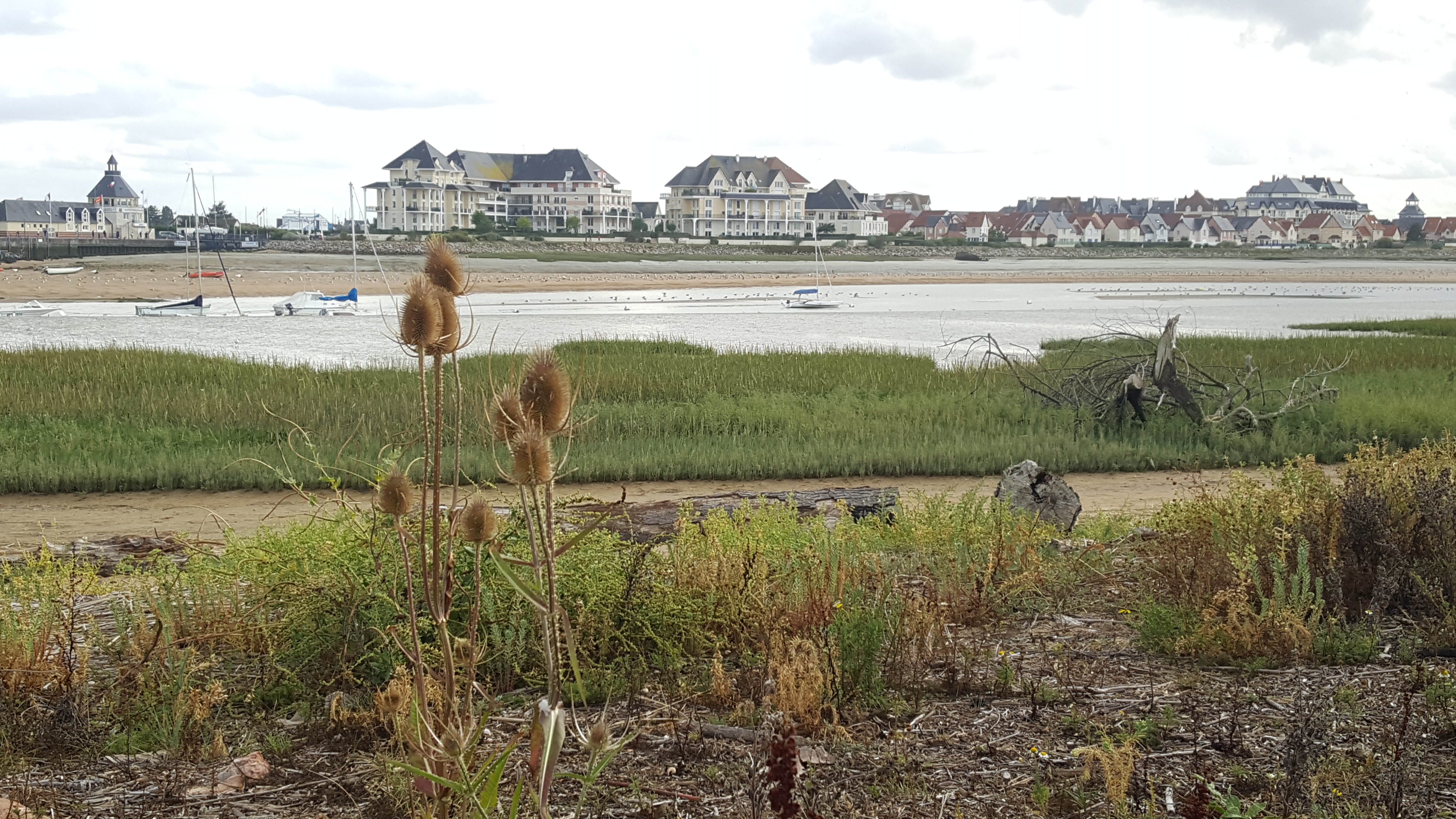 la pointe de Cabourg nous permet d'avoir une très belle vue sur la ville de Houlgate. De la promenade de Cabourg il y a une distance d'environ un kilomètre pour rejoindre la pointe mais ça vaut vraiment le déplacement. Au retour de la pointe nous avons longé l'estuaire et nous avons pris la passerelle Cabourg/Dives sur Mer pour la vue globale de l'estuaire.